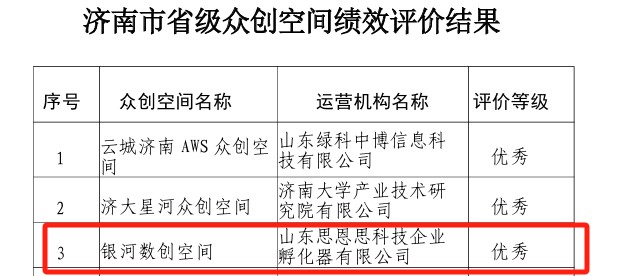 济南科创投集团科技企业孵化载体银河数创空间获评省级优秀等次