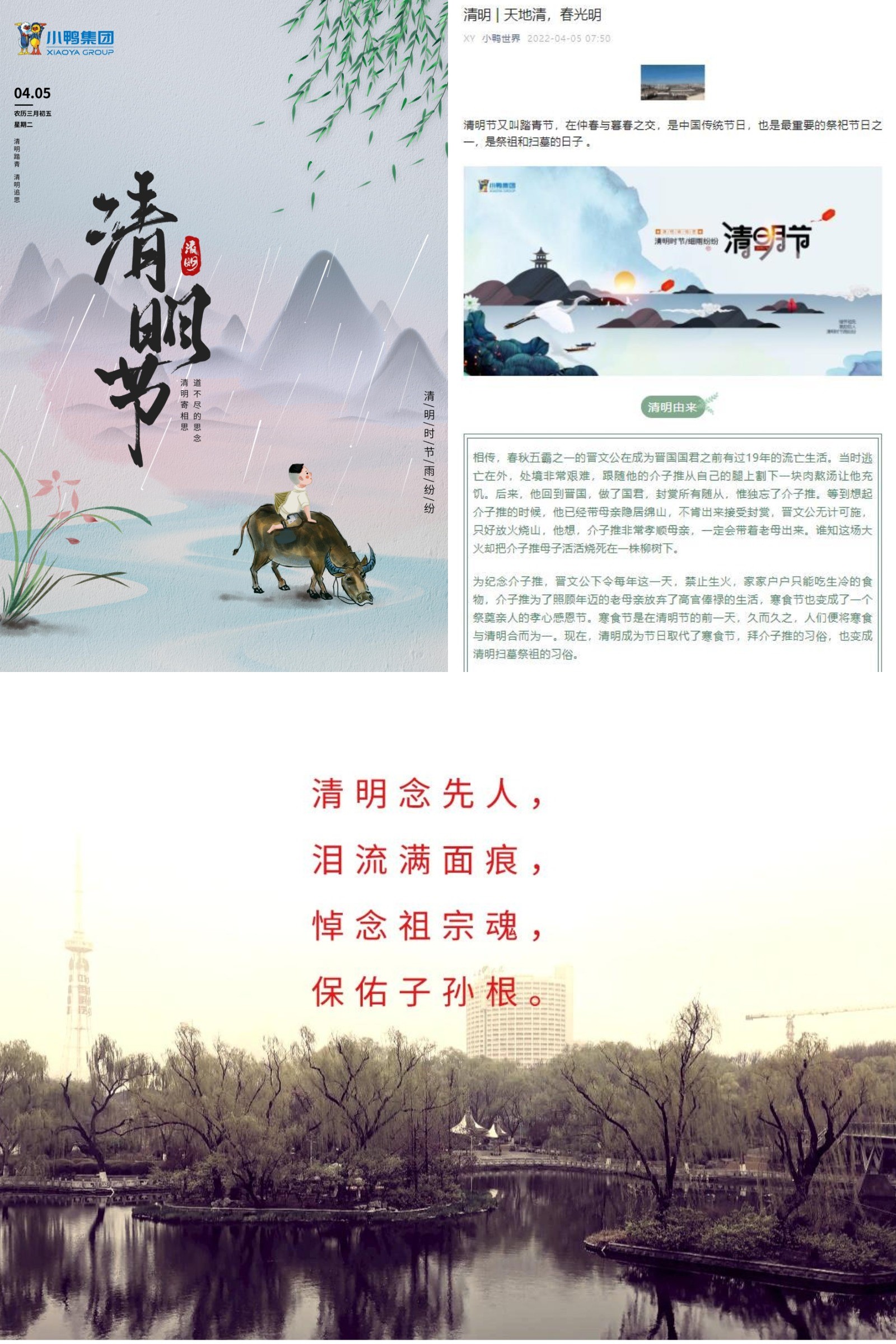 “清明念先人,泪流满面痕,悼念祖宗魂,保佑子孙根。”——澳利集团、小鸭控股集团向广大干部职工开展约稿活动,广大干部职工用镜头、文字、海报等形式宣传清明节的历史渊源与习俗,表达对先人的怀念之情,展现了中华传统文化,弘扬孝道亲情,树立科学文明的祭祀新风。